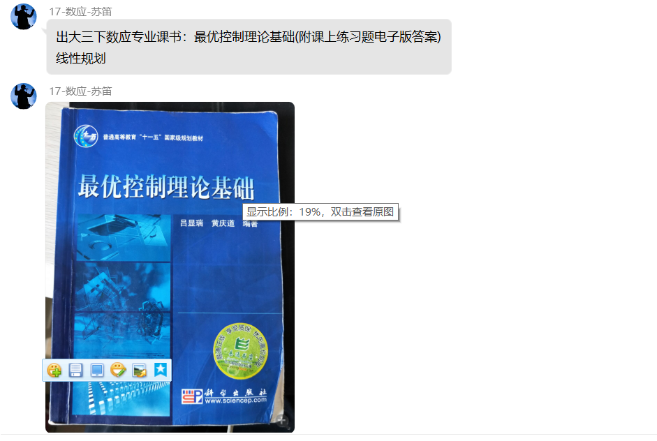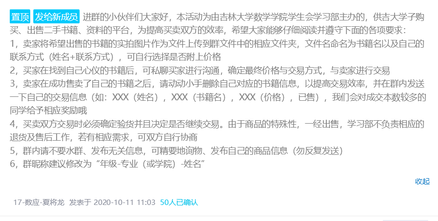 为了保证交易的高效性和公平性,我们也制定了一些规则。活动规则具体如下:1.卖家将希望出售的书籍的实拍图片作为文件上传到群文件中的相应文件夹,文件名命名为书籍名以及自己的联系方式(姓名+联系方式),可自行选择是否附上价格;2.买家在找到自己心仪的书籍后,可私聊买家进行沟通,确定最终价格与交易方式,与卖家进行交易;3.卖家在成功售卖了自己的书籍之后,请删除自己对应的书籍信息,以提高交易效率,并在群内发送一下自己的交易信息(如:XXX(姓名),XXX(书籍名),XXX(价格),已售);4.买卖双方交易时必须确定验货并且决定是否继续交易。