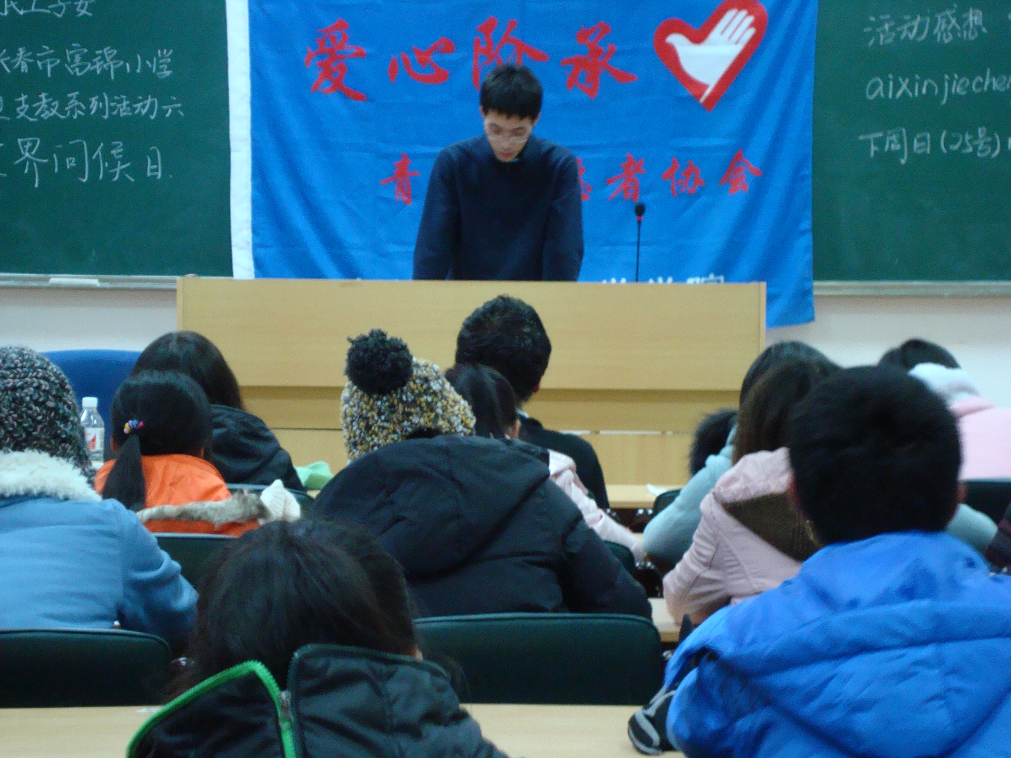 2012年11月15日晚6点,h动画 爱心阶承青年志愿者协会在数学楼一楼报告厅举办了“走进长春市富锦小学--大型支教活动”系列之第六届“世界问候日”主题活动的志愿者培训。
