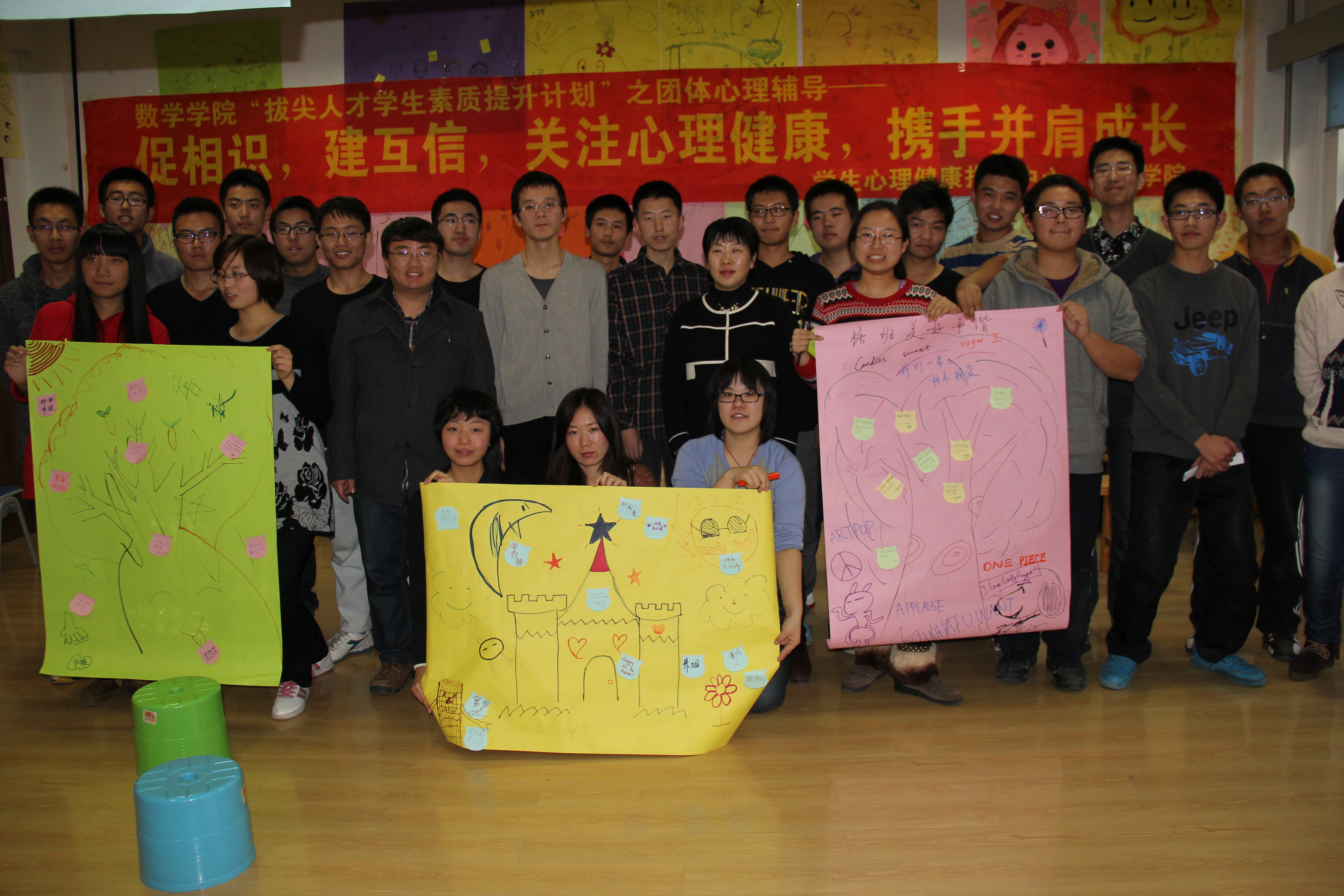 学生心理健康指导中心的何思彤老师用一个“一分钟拍手”的小游戏给大家热身,让大家意识到自己的潜力超过自己的想象;随后是一个“争先登岛”的游戏,同学们被分为三组,每组同学要在限定时间内一起站到仅有一张报纸的面积内,这增强了同学们的团队意识和协作能力;接着是关于信任的游戏,每人都将在不能说话的情况下把戴着眼罩的同学顺利的引领过布满障碍的房间,这个游戏提高了大家之间的信任程度;然后是“价值拍卖”的游戏,从这个游戏中同学们意识到了对自己最重要的是什么;活动最后每个小组的同学画了自己小组的树,并在树上贴上了自己的愿望。