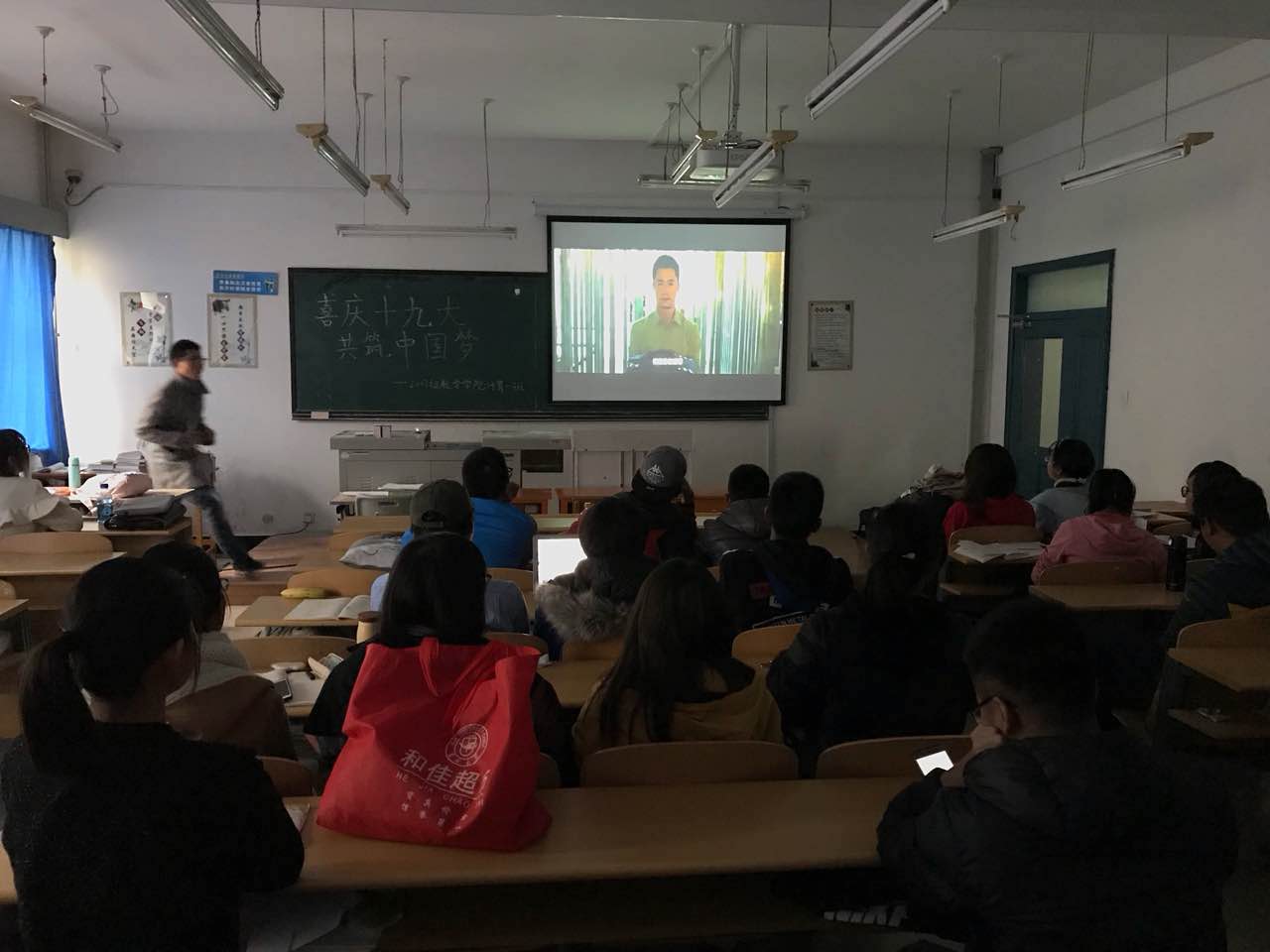 第二阶段为激发同学爱国热情,寓教于乐,播放了影片《战狼2》。同学们认真观看,情陷其中,观看影片同时爱国之情愈发强烈,产生了对国家对十九大的深深思考,观看完毕后集中讨论并由一些同学来讲述感想及关于十九大的看法。