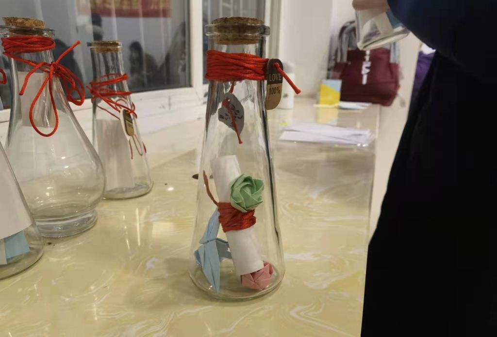 收集完漂流瓶后,我们活动的负责人同学将漂流瓶摆放整齐,大家就开始挑选自己中意的漂流瓶。看似小小的瓶子,实则承载着十分重要的意义。瓶子中承载的可能是某位同学对未来的期望,想要与他人分享喜悦的心情,亦或者是关于难过烦恼的解囊。