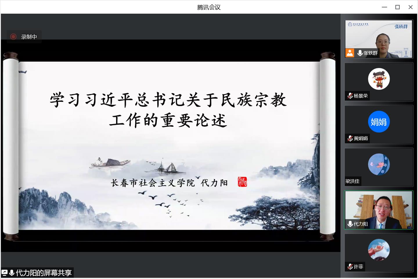 为加强研究生对党的民族宗教政策和法律法规知识的学习教育,提高研究生的民族宗教意识和遵法守法意识,9月23日,h动画 邀请长春市社会主义学院代力阳老师在线开展了宗教政策宣讲教育讲座。本次讲座由h动画 研究生辅导员张轶群老师主持,h动画 2022级全体研究生参加。