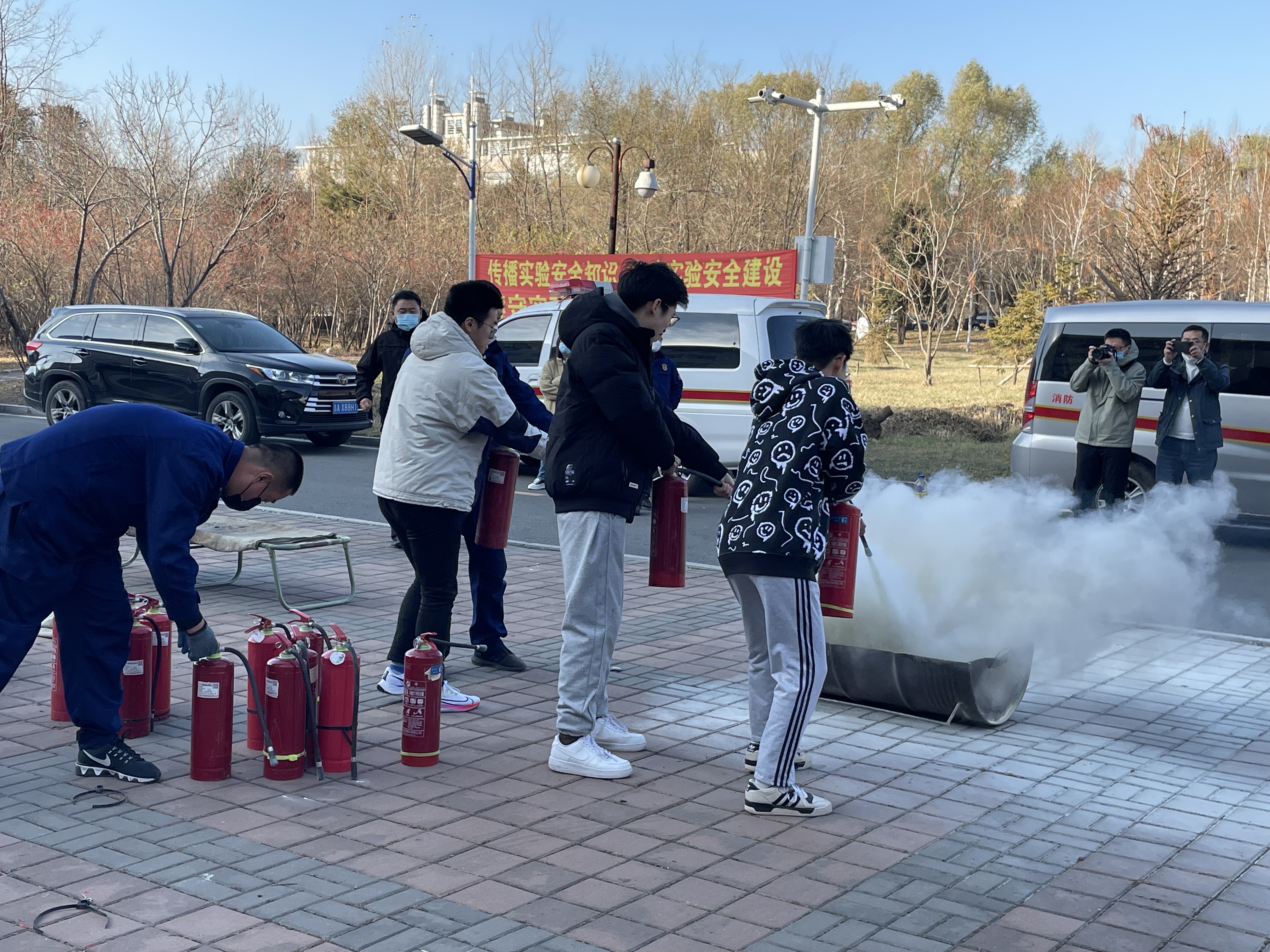 讲座结束后,在保卫处老师们的精心准备下,同学们参加了消防安全演练。火灾警报拉响,楼内浓烟密布,同学们快速反应,立刻行动,迅速按照规定逃生路线撤离到安全地点。在数学楼停车场,董老师为大家介绍了常规消防设施的使用,并现场演示了干粉灭火器的正确使用方法,让大家对消防知识有了更直观的了解,还有几位同学参与了实际操作演练。