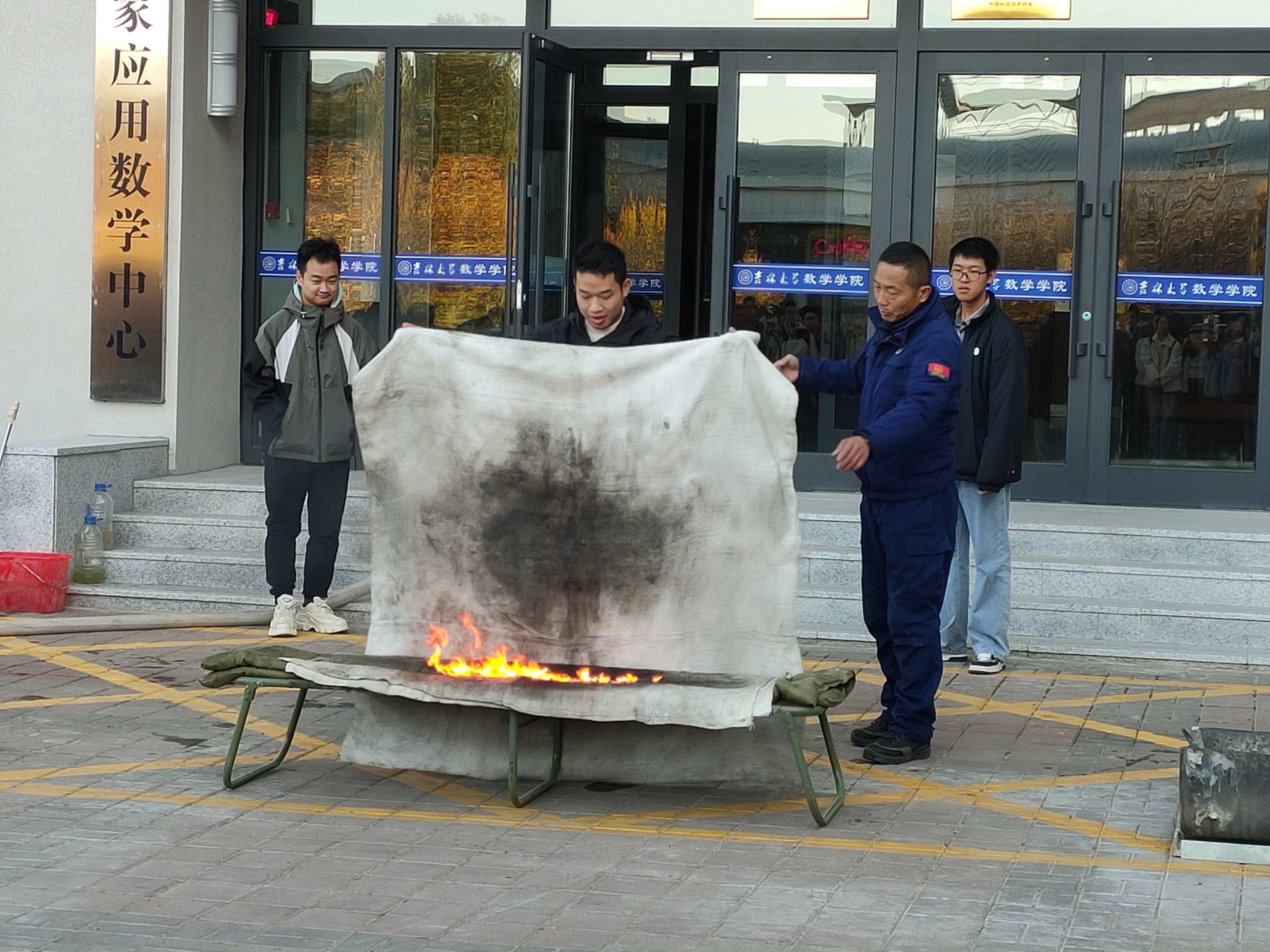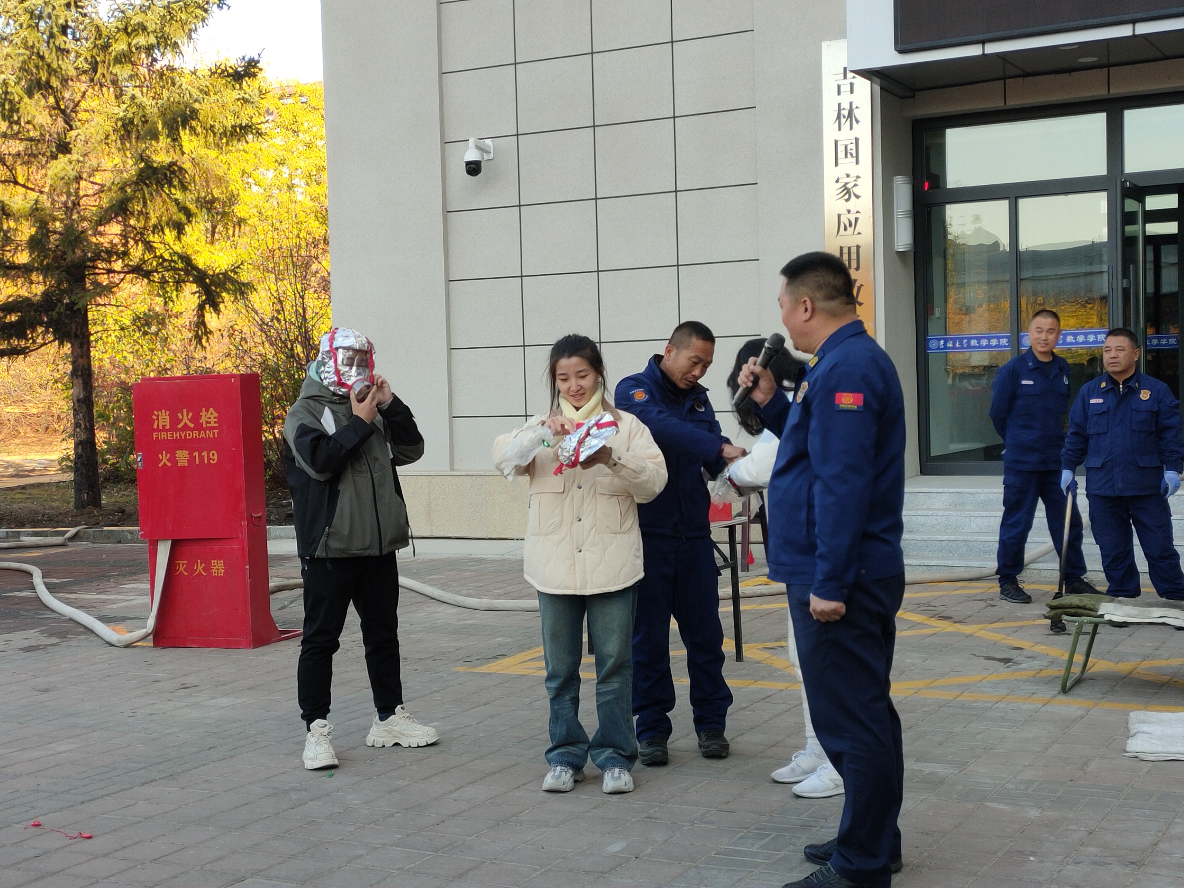 随后,保卫处模拟了火灾现场的浓烟和烈火,全体学生安全有序地疏散到楼前场地。在室外,保卫处的消防干事们细致讲解了各种类型的消防防毒面具、灭火器、灭火毯的用处与使用方法,先由保卫处的消防干事进行演示,再让部分学生志愿者亲身体验,加深了对各类消防器具的了解和使用技能。