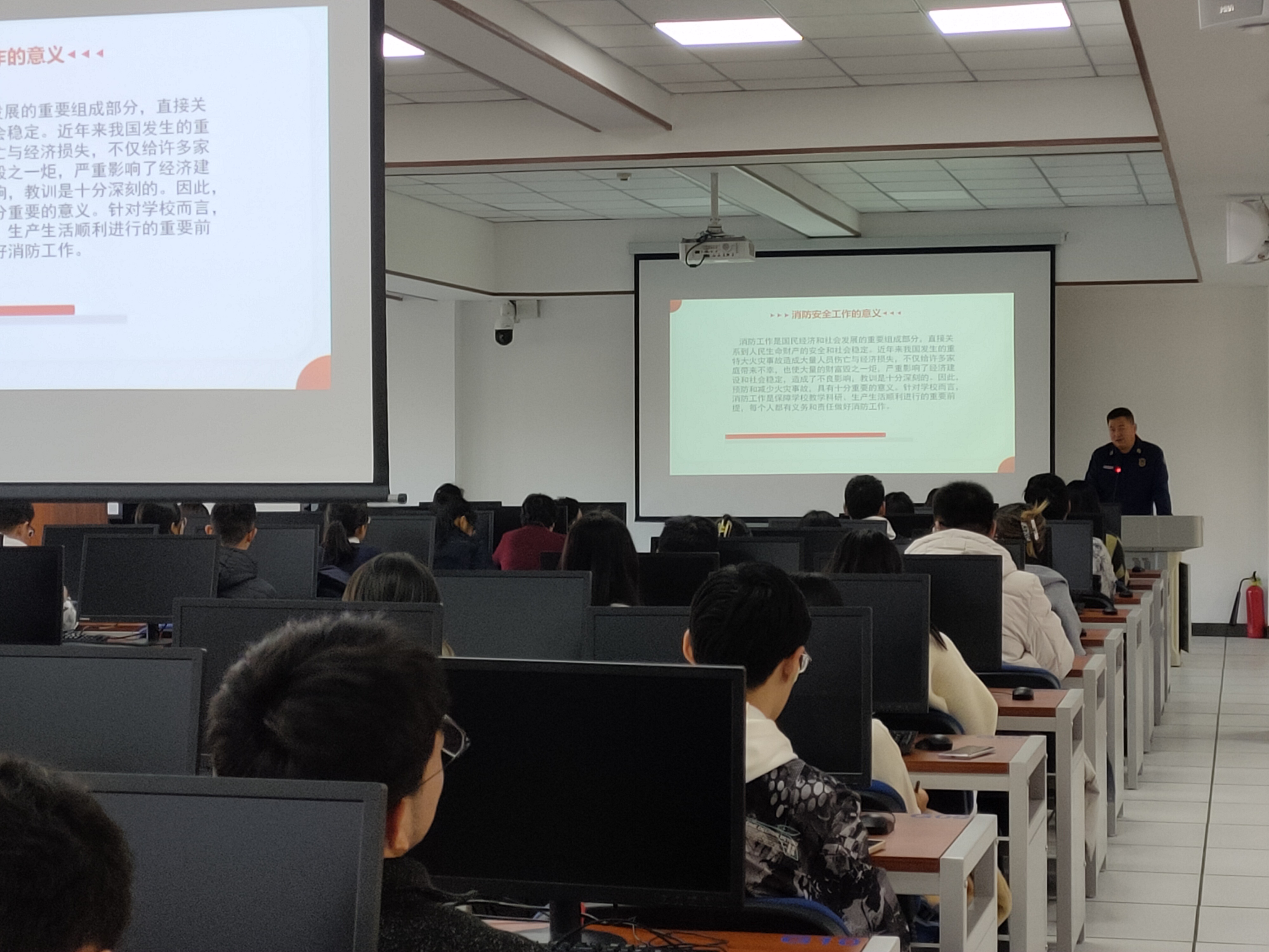 消防安全管理规定,落实安全制度,强化安全管理,简明地讲述了基本的消防安全知识。然后,董老师以多起大型火灾事故为例,结合视频进行讲解,警示同学们注意不要做出违规行为,如人走不断电、在床上长时间充电等;普及火场的正确逃生办法,如湿毛巾捂住口鼻、禁止乘坐普通电梯等,同学们都受益匪浅。