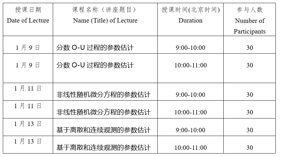 第一讲主要介绍分数O-U过程的性质及最小二乘参数估计 第二讲介绍了一类非线性随机微分方程的参数估计 第三讲主要介绍了基于离散和连续情形的随机微分方程参数估计