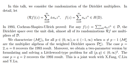 报告题目:The Random Weighted Dirichlet Multipliers