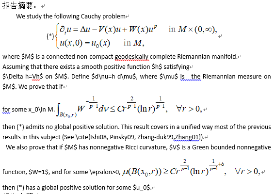 报告题目:On existence of positive global solutions to a semilinear parabolic equation with a potential term on Riemannian manifolds