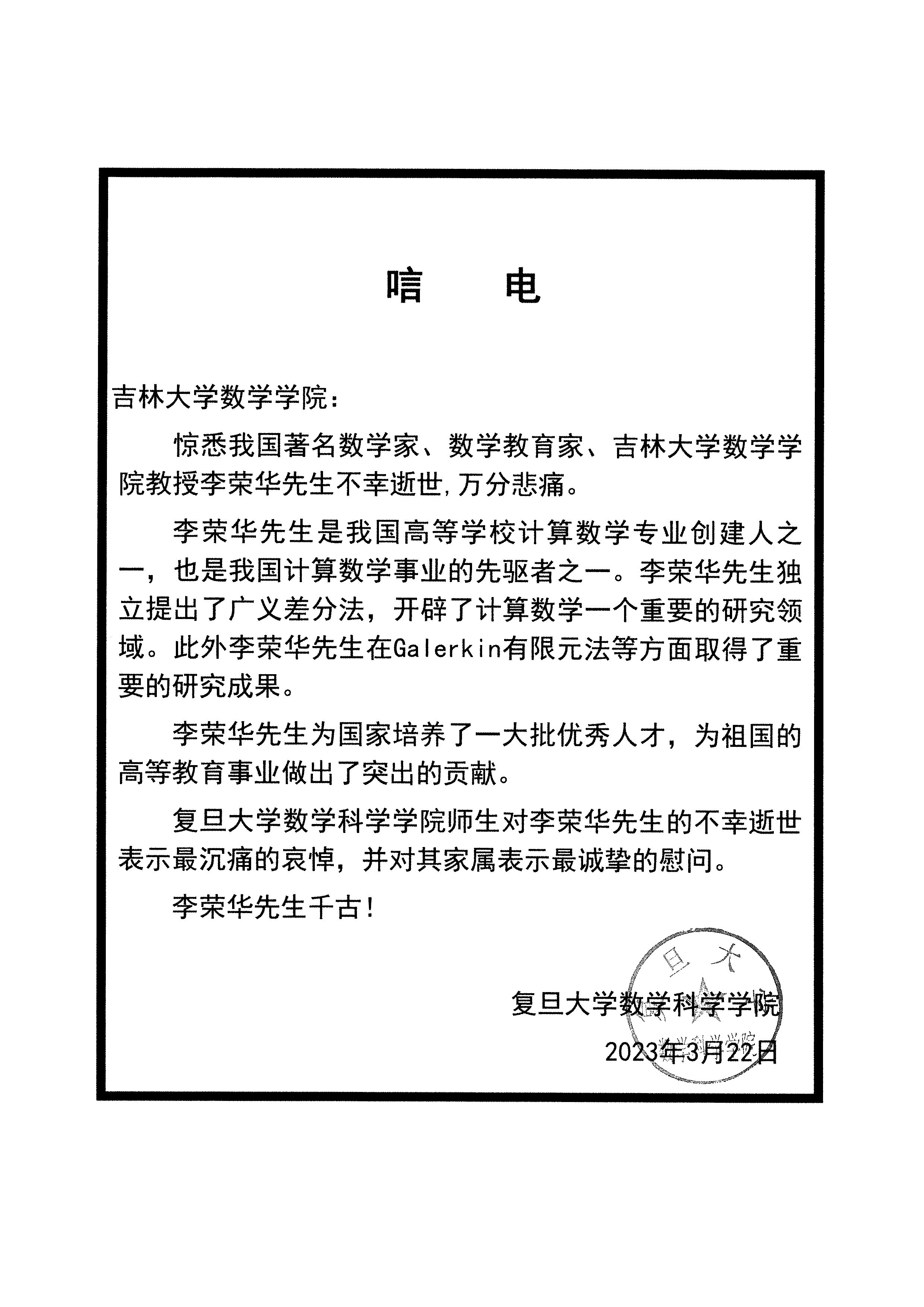 复旦大学数学科学学院唁电