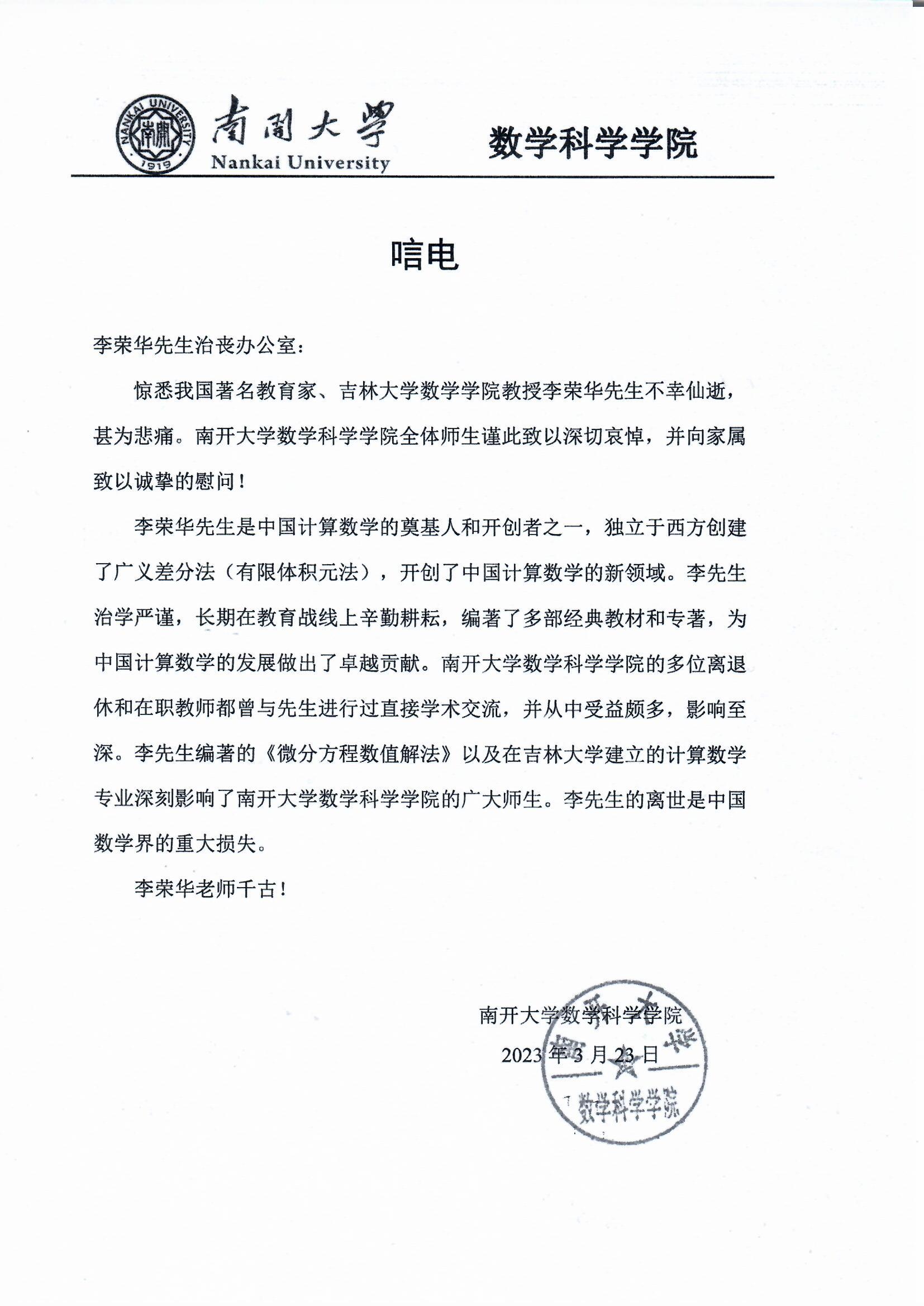 南开大学数学科学学院唁电