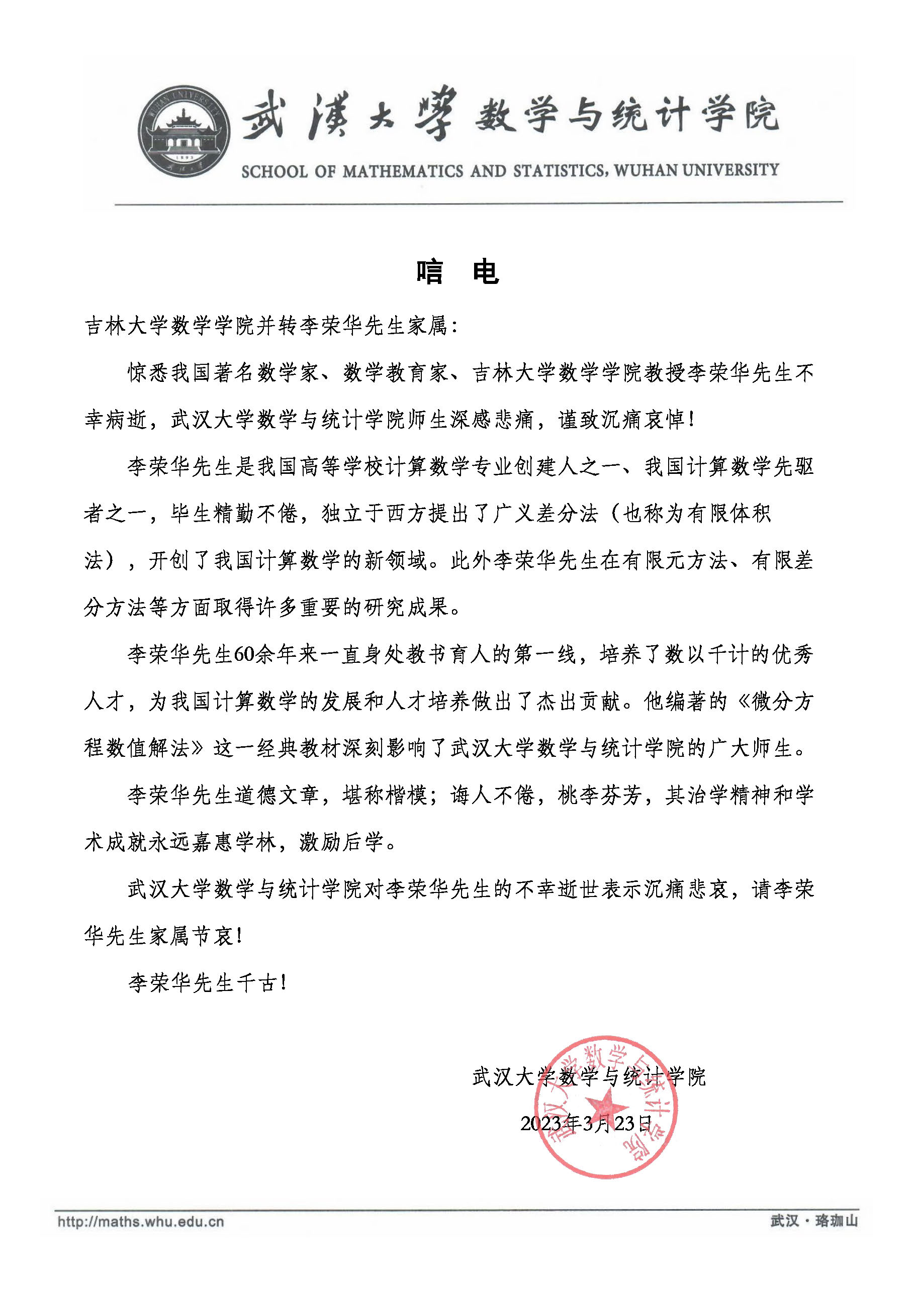 武汉大学数学与统计学院唁电