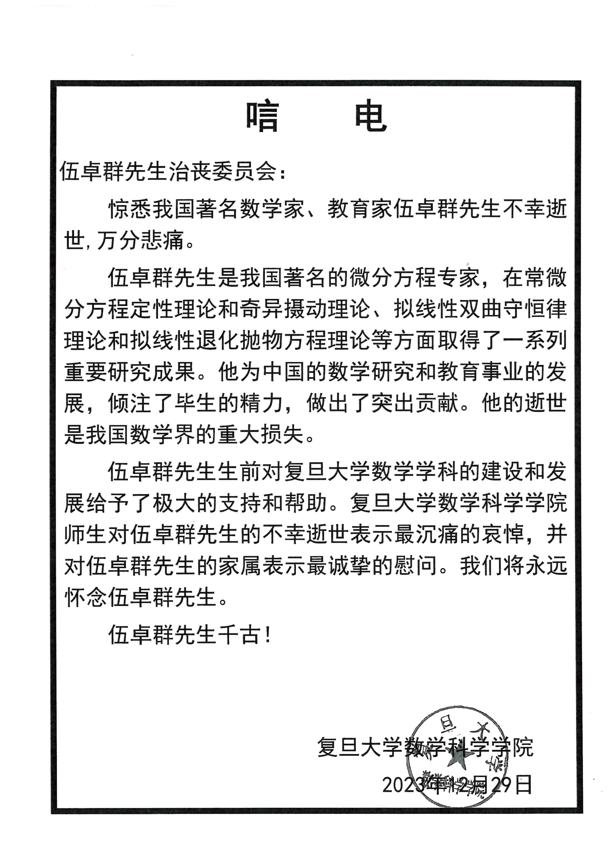 复旦大学数学科学学院唁电
