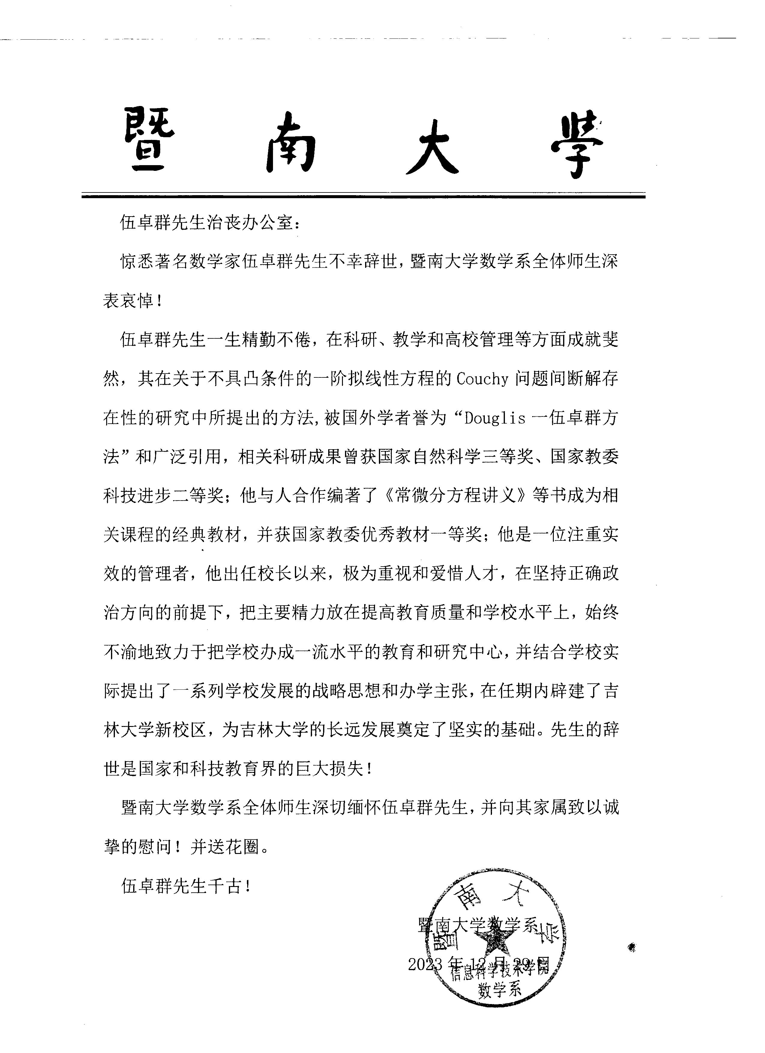 暨南大学数学系唁电