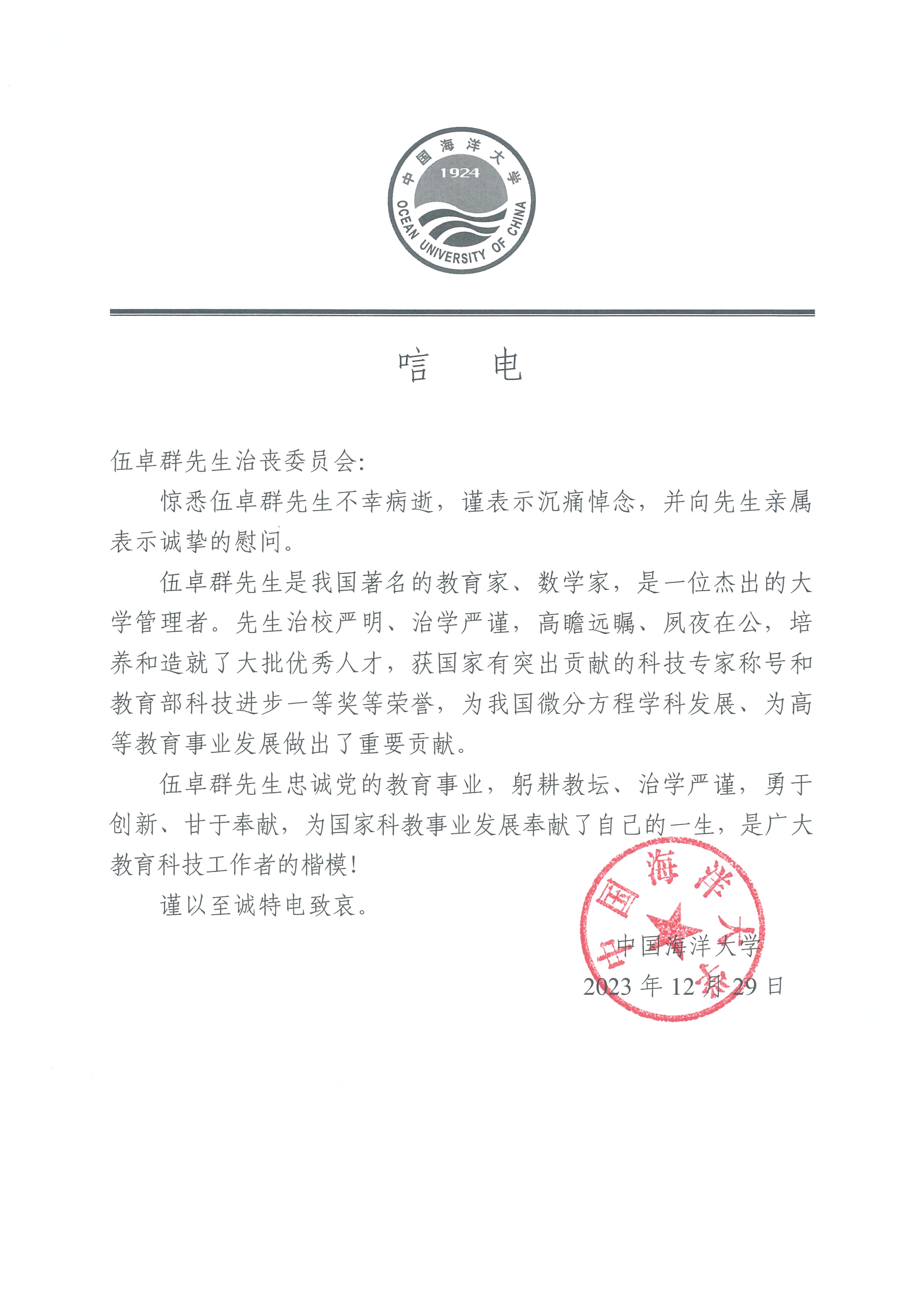 中国海洋大学唁电