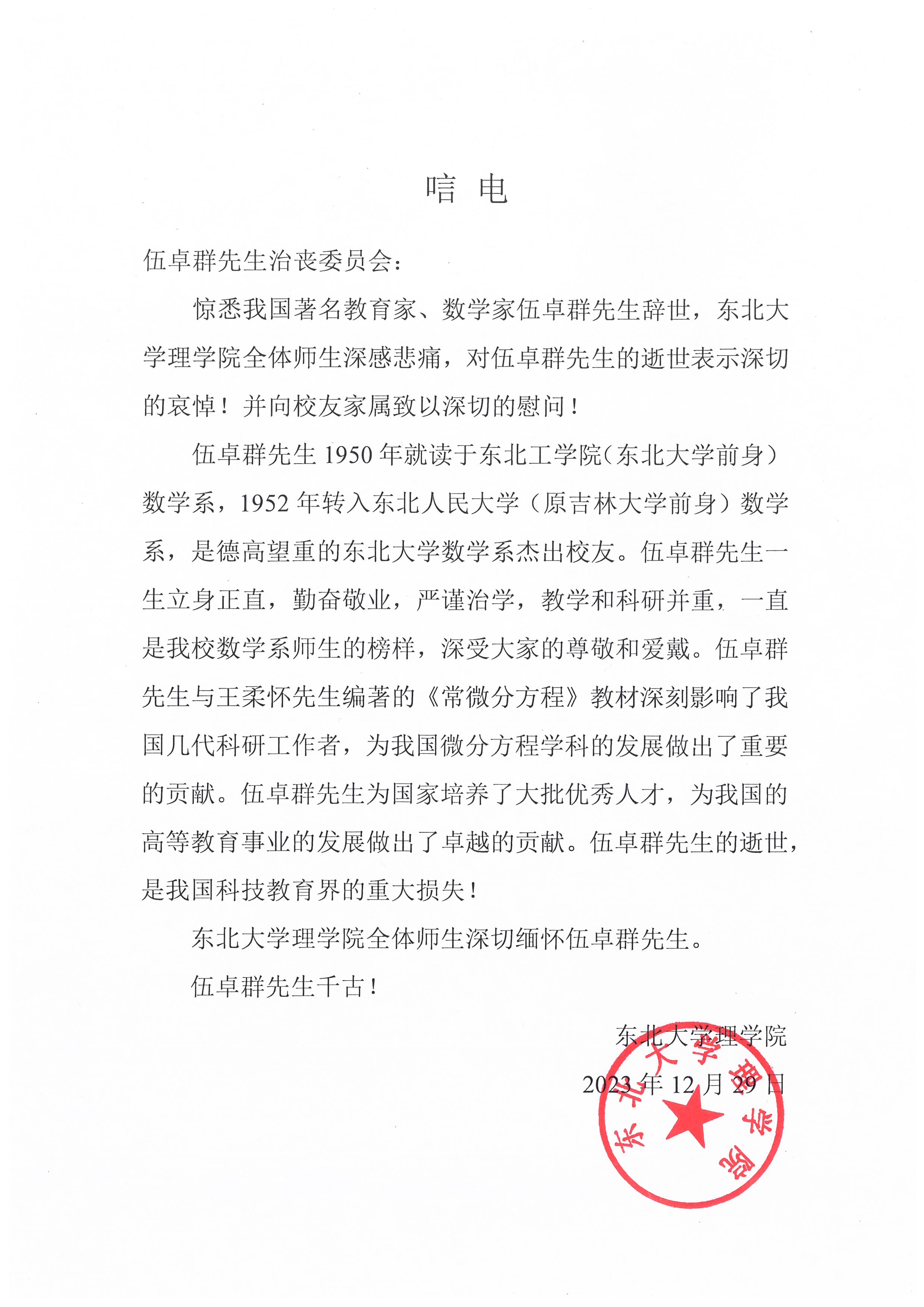 东北大学理学院唁电