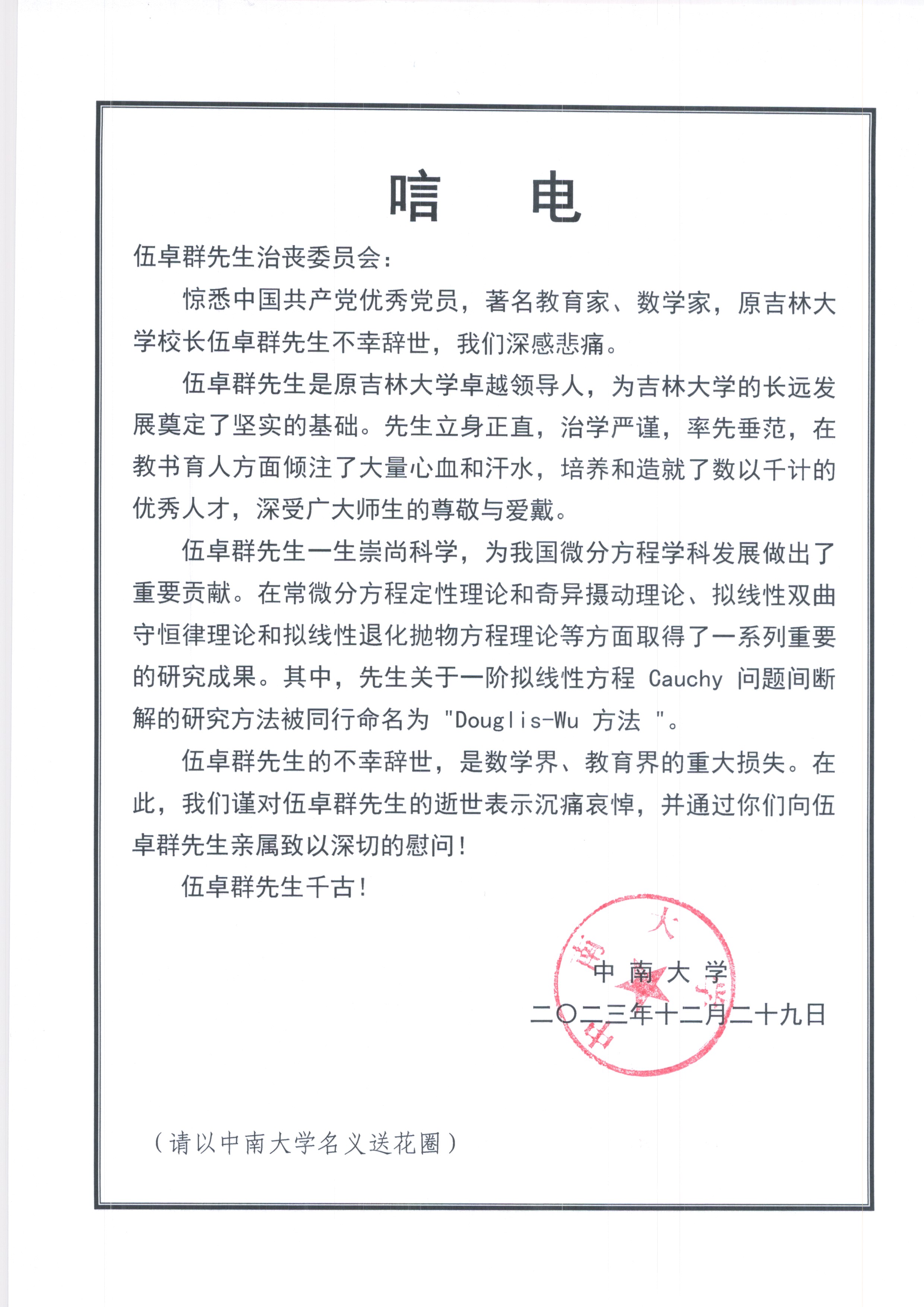 中南大学唁电