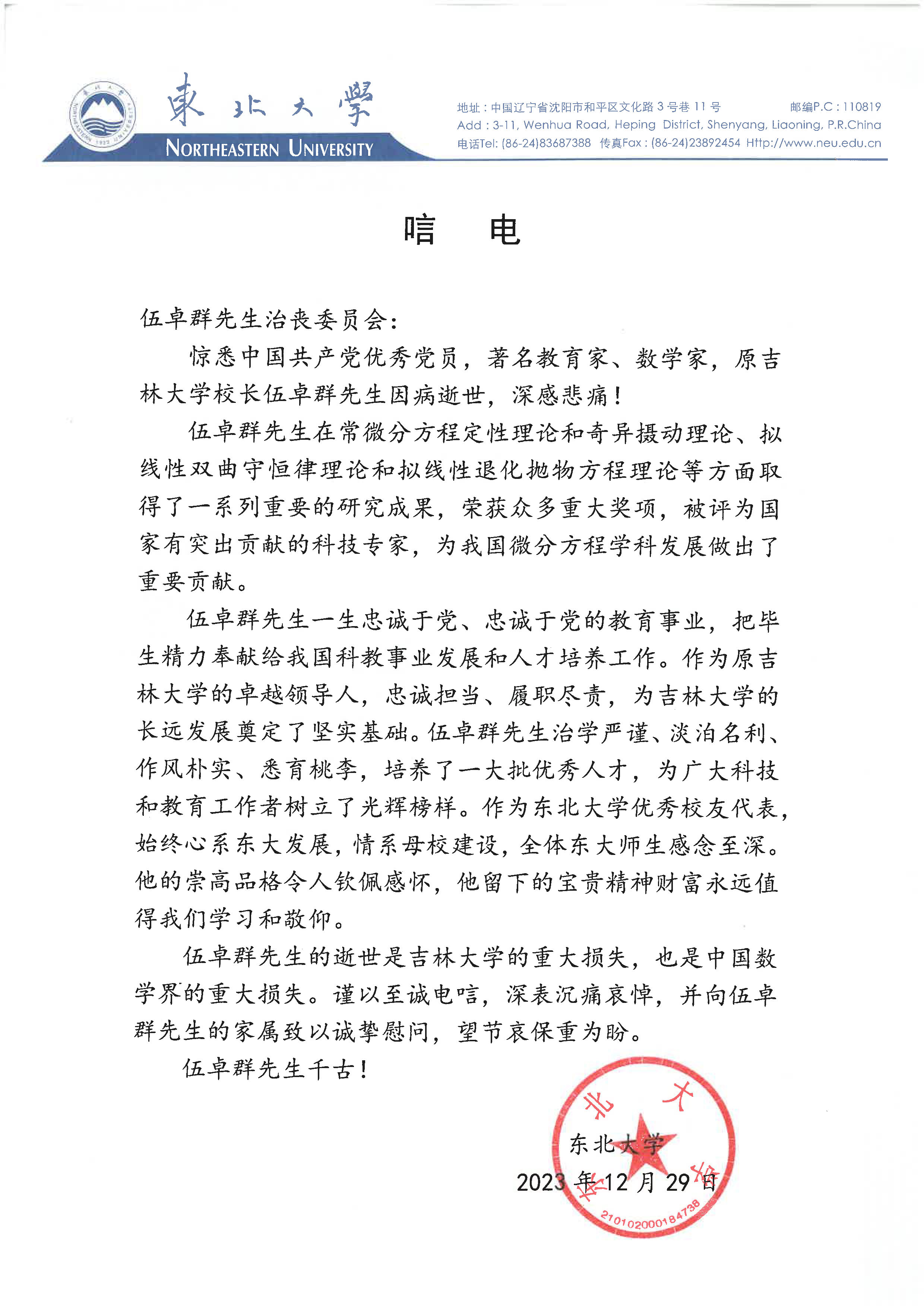 东北大学唁电