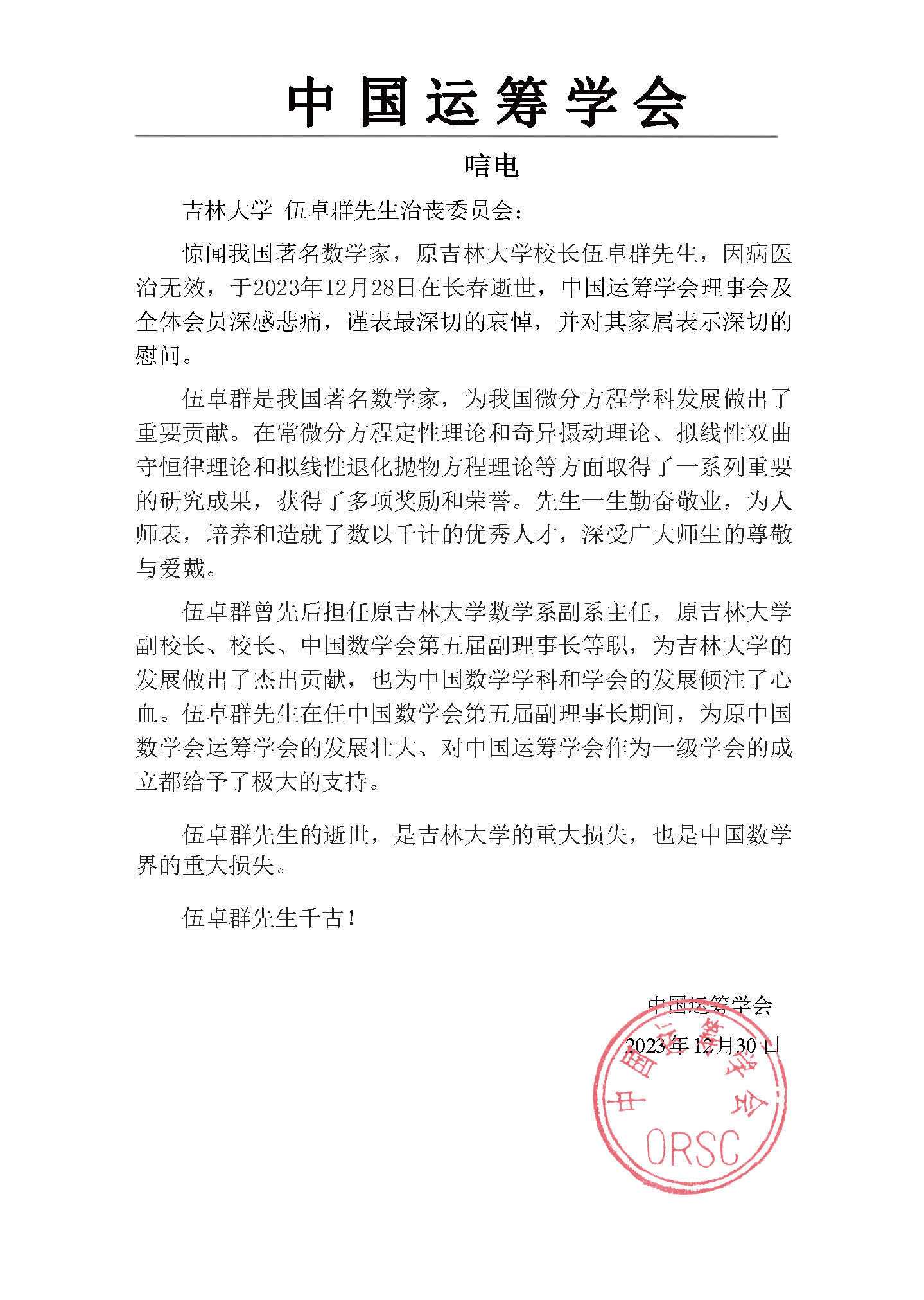 中国运筹学会唁电